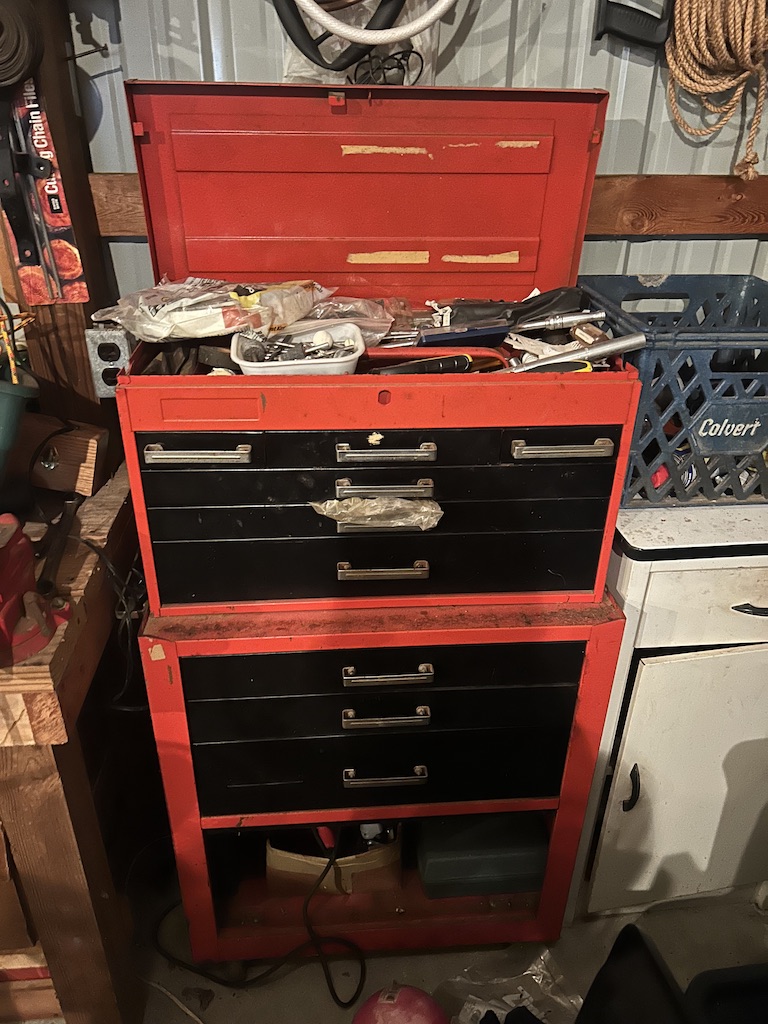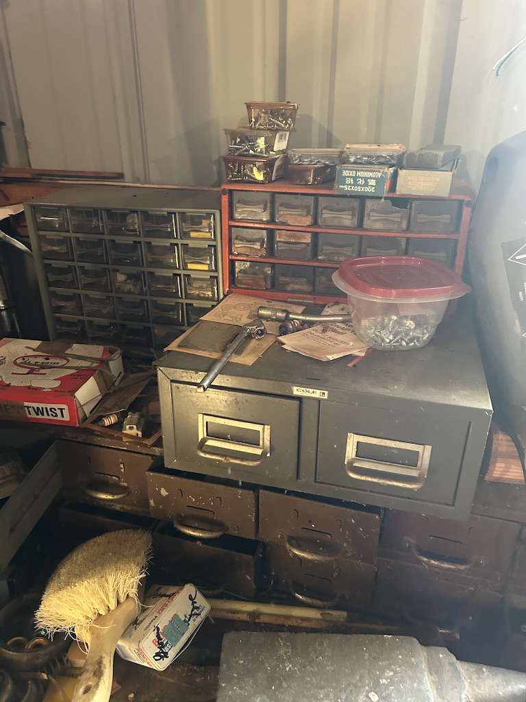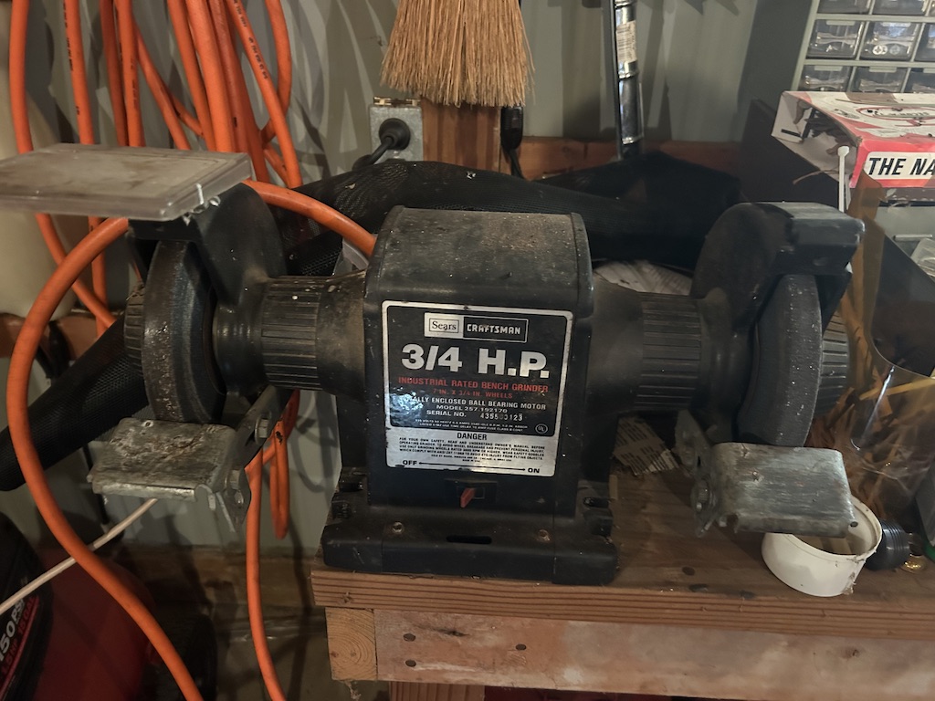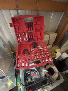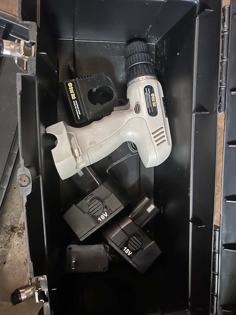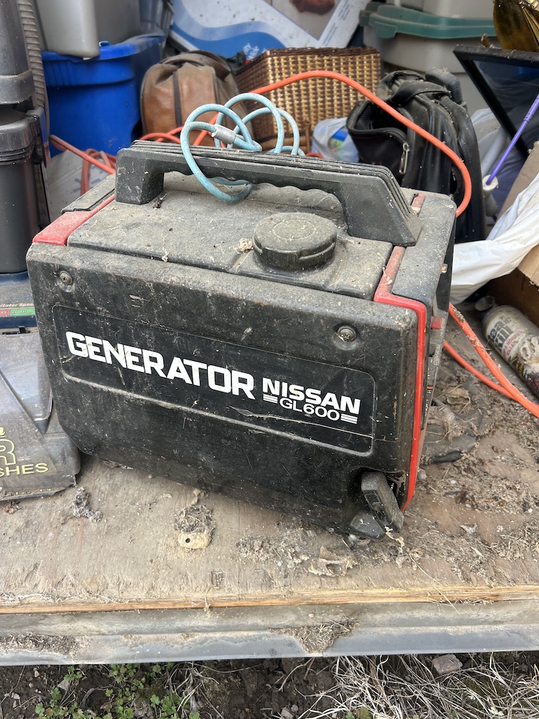 Hampton 4000 Watt Port. Generator • Large Box on Castors • Craftsman Tools • Power Tools • C Clamps • Electric Cords • Century 12V Battery Charger • Oils & Solvents • Nut & Bolt Bins • 18V Battery Drill • Small Tool Box • Craftsman 150psi Air Compressor • Pipe Wrenches • Craftmans 3/4 HS Grinder • ATV Jack • 6’ Aluminum Ladder • 8’ Aluminum Ladder • Shop Brooms • 30lb Gas Cylinder •
