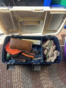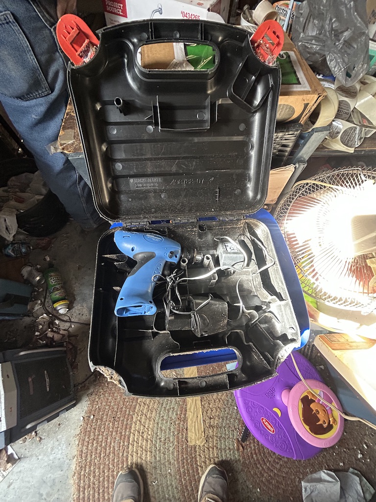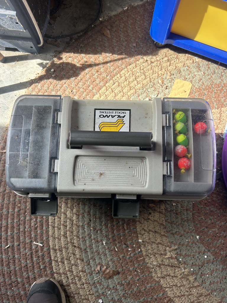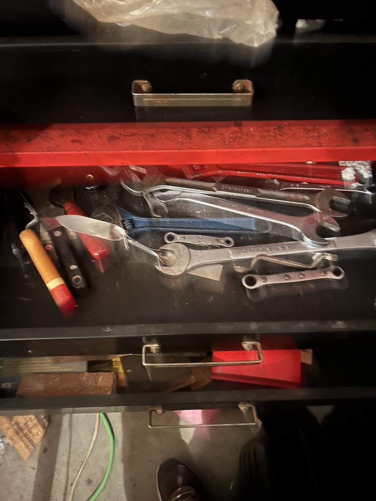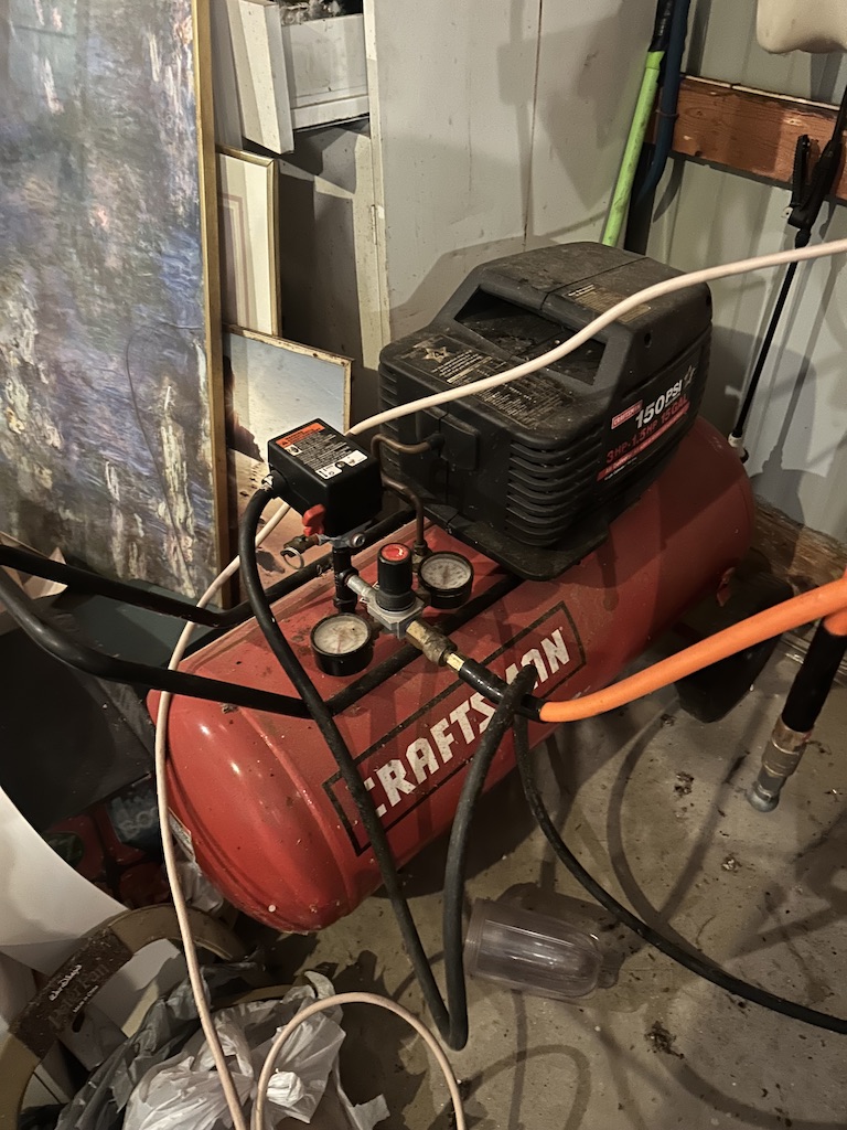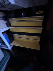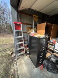Hampton 4000 Watt Port. Generator • Large Box on Castors • Craftsman Tools • Power Tools • C Clamps • Electric Cords • Century 12V Battery Charger • Oils & Solvents • Nut & Bolt Bins • 18V Battery Drill • Small Tool Box • Craftsman 150psi Air Compressor • Pipe Wrenches • Craftmans 3/4 HS Grinder • ATV Jack • 6’ Aluminum Ladder • 8’ Aluminum Ladder • Shop Brooms • 30lb Gas Cylinder •